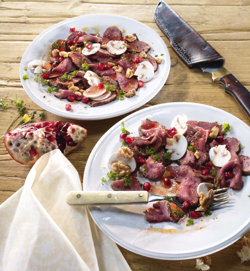 Rezept für 10 Personen 1,2 kg Rehrücken, ausgelöst, pariertSchwarzer Pfeffer aus der MühleSalzPflanzenöl zum Anbraten1–2 Granatäpfel, je nach Größe100 g Walnusskerne,alternativ geröstete Pinienkerne250 g rosa Champignons, klein und festeinige Stängel glatte Petersilie2 Zitronen150 ml Olivenöl3 EL QuittengeleeMaldon Sea Salt Ofen auf 180 °C Grad vorheizen. Beide Rückenstränge pfeffern, kurz scharf von allen Seiten anbraten und für … Rehcarpaccio mit Walnuss und Champignons weiterlesen