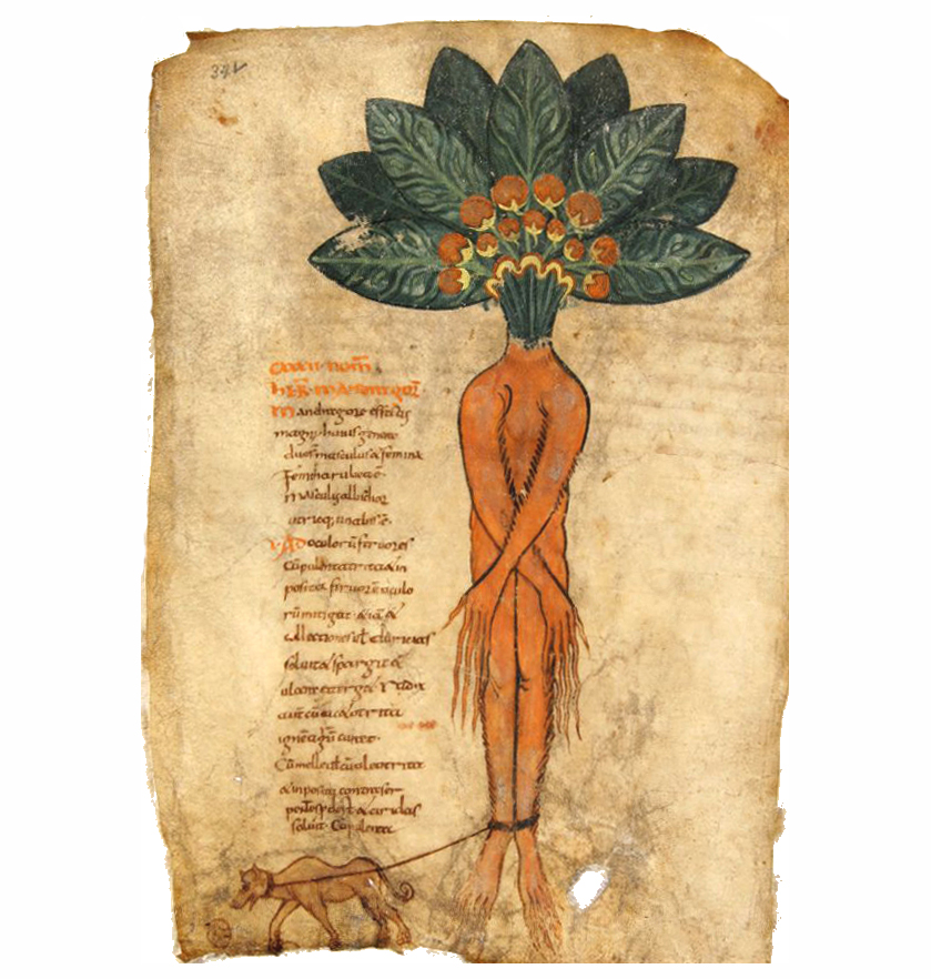 Die ausführlichste Schilderung dieser magischerotischen Wurzel samt ihrem Sammelritual stammt von Flavius Josephus (1. Jh.), der auf Griechisch schrieb, um den Griechen die Sitten des Volkes von Judäa verständlicher zu machen. Möglicherweise hatte er sein magisches und botanisches Wissen von den Essenern, unter denen er längere Zeit lebte, erworben (Kottek 1994: 163*): „In dem Tal, das sich an der Nordseite der Stadt (Machairos) hinzieht, ist ein besonderer Platz mit Namen Baaras, und dort wächst eine Wurzel, die den gleichen Namen trägt. Jeden Abend strahlt sie einen feuerroten Lichtglanz aus: Will aber jemand sich ihr nahen, um sie auszureißen, so läßt sie sich nur schwer fassen, sie entzieht sich den Händen und kann nicht früher gebannt werden, als bis man Monatsblut oder Urin auf sie gießt. Aber auch dann bedeutet eine unmittelbare Berührung mit der Wurzel den augenblicklichen Tod, es sei denn, man trage sie so in der Hand, daß die Wurzelspitze nach unten schaut. Allein, man kann sich der Wurzel auch ohne jede Gefahr bemächtigen, und zwar so: ringsum gräbt man die Erde ab, daß nurmehr ein kleines Stück der Wurzel von der Erde bedeckt bleibt. Dann bindet man einen Hund daran. Wenn nun dieser dem Menschen, der ihn angebunden hat, wieder folgen will, zieht er natürlich die Wurzel ganz leicht aus dem Boden. Aber im gleichen Augenblick stirbt er, gleichsam zur Sühne für den, der in Wahrheit die Pflanze weggenommen hat. Von jetzt an kann man ohne Furcht die Wurzel angreifen. Der Grund dafür, daß diese Wurzel trotz ihrer Gefährlichkeit so gesucht ist, liegt in ihrer einzigartigen Wirkung: sie hat nämlich die Kraft, die sogenannten Dämonen, das sind Geister böser, verstorbener Menschen, die in noch lebende hinein fahren und sie selbst töten, wenn man nicht zu Hilfe kommt, schon durch bloßes Annähern an die Kranken zu vertreiben.“ (Flavius Josephus, Geschichte des Judäischen Krieges VII, 6, 3)