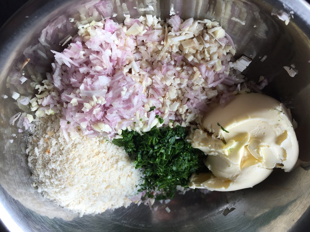 Man entfernt die Stiele, hackt sie klein, gibt fein gewiegte Petersilie, Weißbrotflocken, Schalotten, frische Butter und eine fein gehackte Knoblauchzehe dazu.