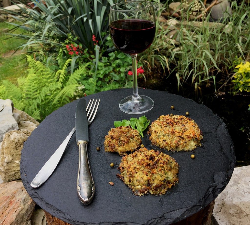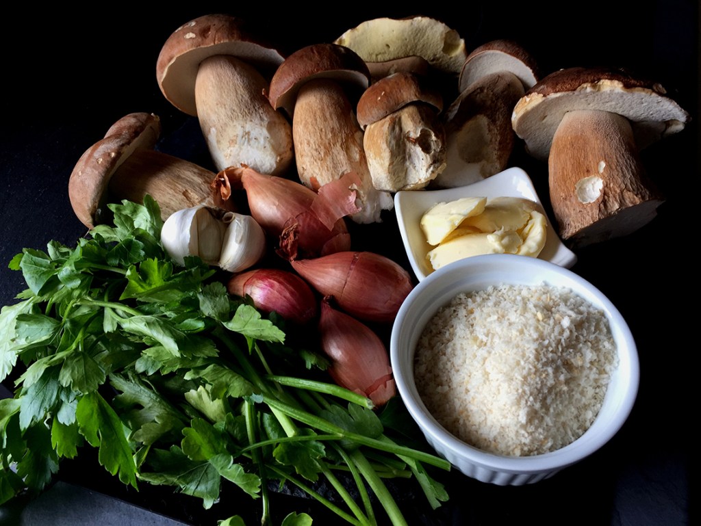 Aus diesen Zutaten formt man eine Paste, würzt sie mit Salz, Pfeffer und wenig scharfen Paprika, garniert damit die Unterseite der Steinpilzhüte…