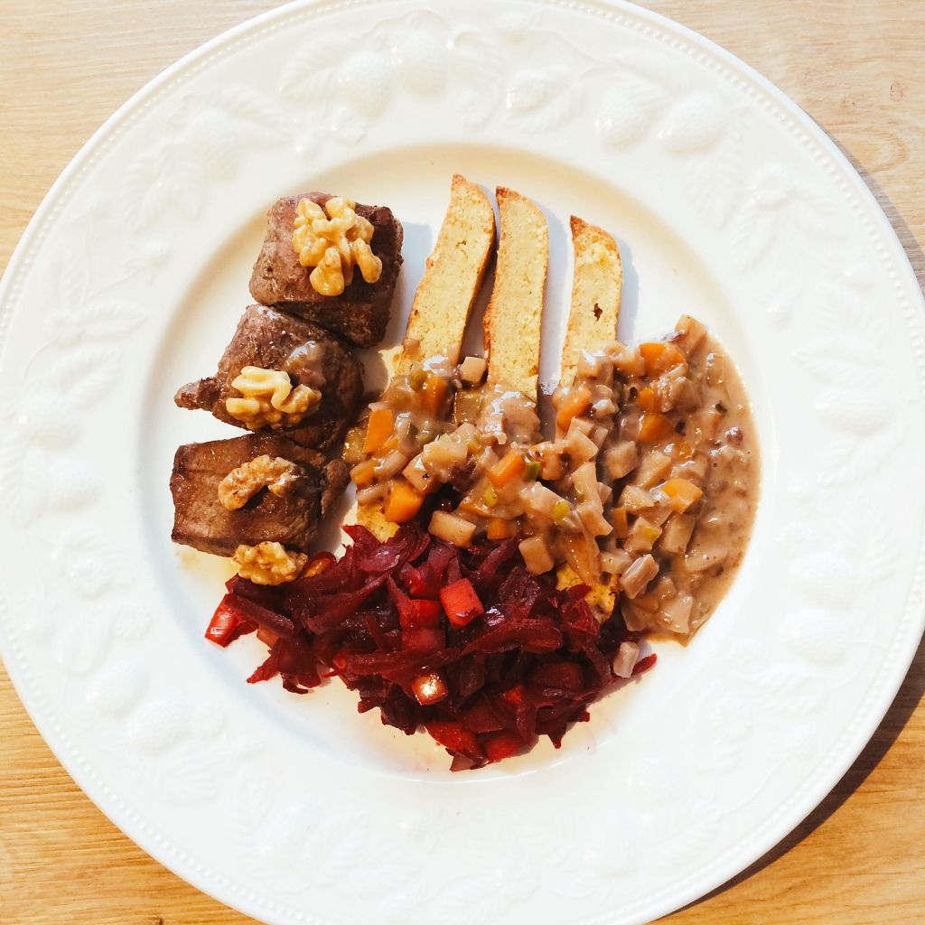 Hinweise zu möglichen Beilagen gibt es bei Klink nicht, es bleibt also dem Koch überlassen, sich etwas zu überlegen. Ich hatte mich für ein Rote-Beete-Kraut entschieden, das ich in einem anderen Rezept als Beilage zu Hirsch gesehen hatte. Konnte mir vorstellen, dass der leicht erdige Geschmack auch gut zu Wildschwein passen würde. Da dies jedoch nicht auf Gegenliebe der werten Frau Gemahlin stieß, habe ich darauf verzichtet das Soßengemüse zu pürieren, um nicht nur Soße sondern eine weitere Gemüsebeilage zu erhalten. Abgerundet wurde das Ganze durch „Semmeltorte“, eine brotartige Beilage aus Semmelbrösel, Mandel, Ei, Butter und Gewürzen.