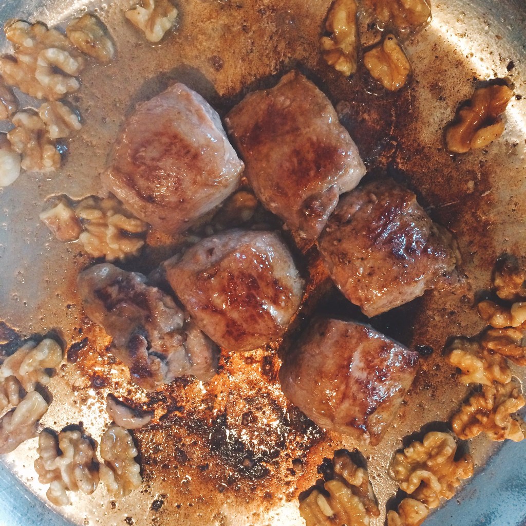 Der Rücken wird pariert, ausgelöst und in Medaillons geschnitten. Diese werden gepfeffert und gesalzen und in der Pfanne angebraten; gegen Ende werden die Nüsse hinzugefügt. Das Fleisch im Ofen bei milder Hitze gar ziehen lassen.