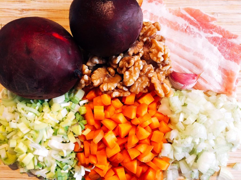 Vincent Klink bereitet das Rote-Bete-Kraut zu Hirschnüsschen zu, ich habe es als Beilage zu Wildschwein gereicht (dafür sind auch das Röstgemüse und der Speck gedacht).