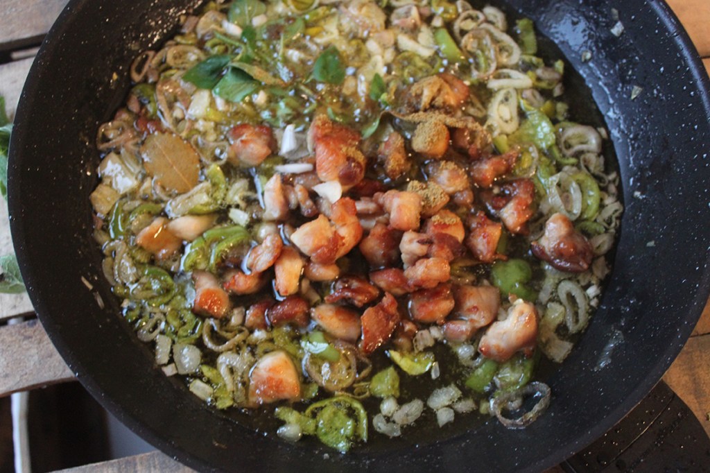 1. In einer großen Pfanne acht Esslöffel Olivenöl erhitzen, Lorbeerblätter dazugeben, Fleischwürfel darin kastanienbraun anbraten, leicht salzen, aus der Pfanne nehmen und beiseitestellen.