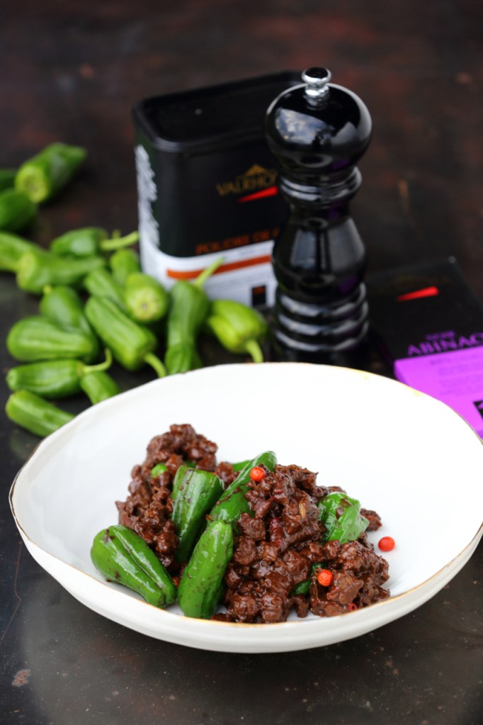 4. Jetzt Espressi, Schokolade, Kakaopulver und Pimientos de Padrón in die Pfanne geben, gut vermischen und nochmals für zirka 30 Minuten bedeckt vor sich hin simmern lassen. Dann Deckel entfernen und Soße auf gewünschte Konsistenz einkochen lassen, eventuell mit etwas Salz, Zucker und Chili abschmecken, nach Belieben frischen Oregano und etwas Crème Fraîche untermischen und heiß servieren.