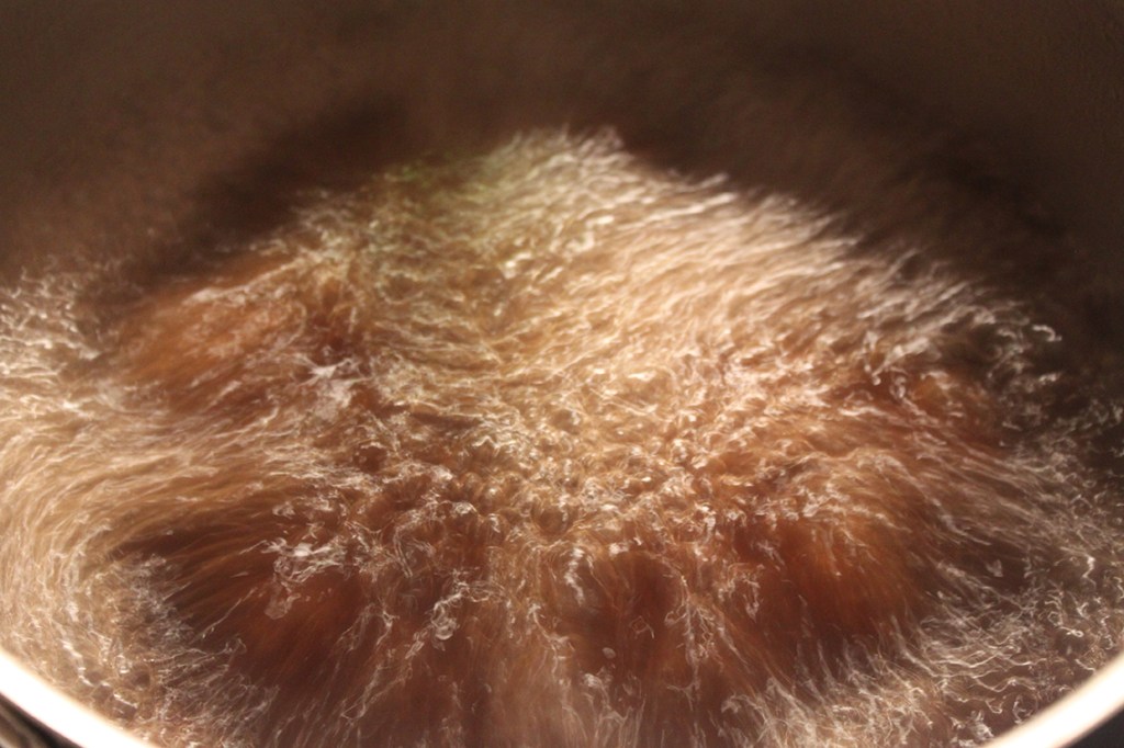 Zu der Rotwein-Knochen-Gemüse-Mischung kommen jetzt noch 6 Nelken, 4 Wacholderbeeren, ein TL schwarze Pfefferkörner und 4 Körner Piment dazu. Und 6 Liter Wasser. Oder fünf. Oder so in der Richtung. Diese gesamte Mischung muß jetzt mindestens 4 und maximal 8 Stunden ganz leise Simmern. Die Sauce darf in diesem Stadium auf gar keinen Fall kochen, denn dann wird am Ende die Sauce trüb. Also stelle ich den Herd auf die niedrigste Stufe. Der Inhalt in meinem Topf hat dann so zwischen 60 und 70 Grad Celsius. Das reicht vollkommen.