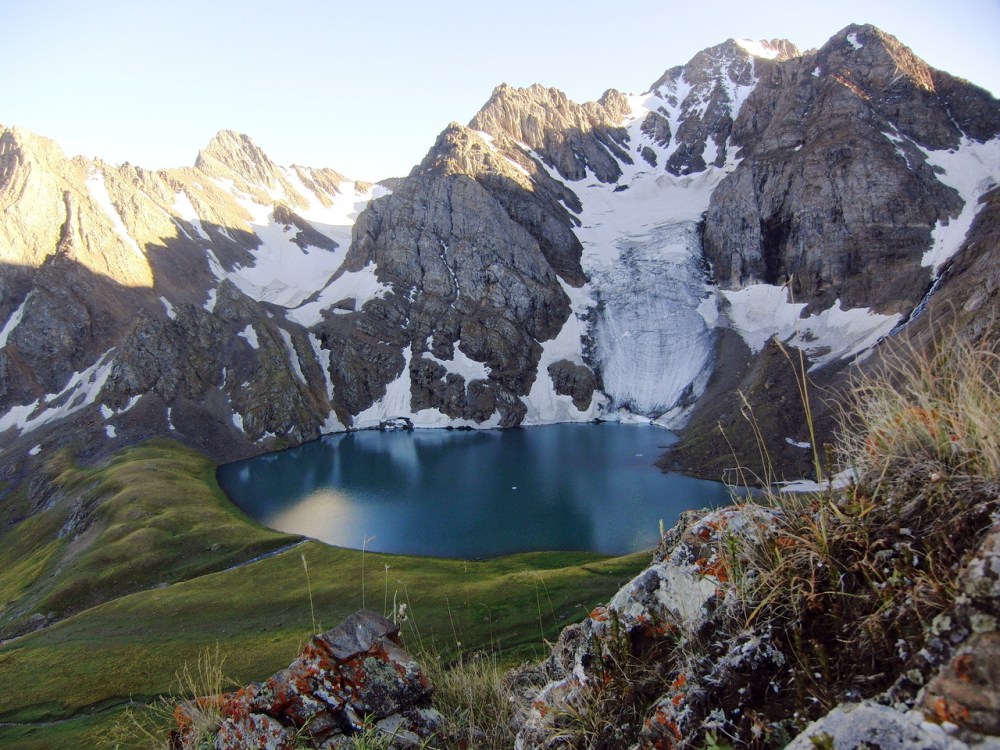 Über den Ala Bel Paß fuhren wir entlang des steil abfallenden Flusses Tschytschkan zum Tiefland des Toktogul-Stausees. Ehe die Schlucht des Flusses endet, durchbricht sie mächtige Wollsackformationen granitähnlichen Gesteins. Dort steht am Rande der Straße unter den Felsen ein idyllisches, blumenumpflanztes Teehaus, wo wir uns im Schatten eines stattlichen Baumes, unter dem sich ein orientalischer Niedrigtisch mit Sitzmatten befand, erfrischten. Kurz vor dem Stausee bogen wir auf einen Feldweg ab, der uns über zwei Stunden hinauf in die Täler des Talas-Alatau führte, dessen Gipfel von Viertausendern beherrscht werden. Hier hat Otto Gries seit etlichen Jahren eine ausgedehnte Konzession.