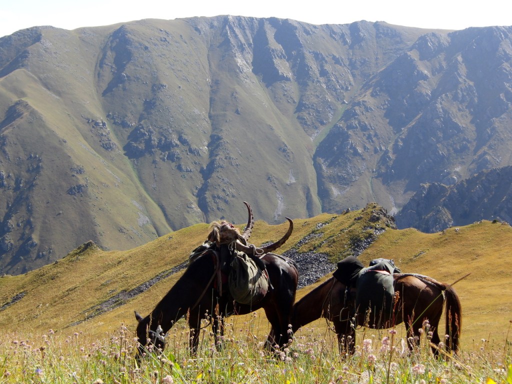 Ira, eine aparte Kirgisin Ende dreißig sprach wie viele Kirgisen relativ gut Deutsch. Immerhin lebten bis zum Zusammenbruch der Sowjetunion an die 100.000 Deutsche im Land, viele davon schon seit den Dreißigerjahren. Auch heute noch gibt es ein paar Tausend. Selbst die beiden kirgisischen Jäger konnten etwas Deutsch. Man lernte zu Sowjetzeiten Deutsch als zweite Fremdsprache in der Schule. Nousurkán war Mitte vierzig, sah jedoch um zehn Jahre älter aus. Er hatte früher getrunken, war aber nun clean. Zwei Front-Goldkronen gaben seinem Lächeln die besondere Note orientalischen Flairs. Er war ein erfahrener Jäger, aber auch einer, der gerne versuchte, den einfachsten Weg zu gehen. Otto mußte ihm immer wieder klar machen, daß die meisten Jagdgäste des Erlebnisses wegen kämen und nicht um möglichst schnell zu Schuß zu kommen. Nurpaís war da aus anderem Holz, war passioniert und wollte für seinen Gast den bestmöglichen Erfolg. Er ging auf die dreißig zu. In dem Dorf, wo er aufgewachsen war, wohnten damals fast nur Deutsche, und er wußte sehr positiv über ihre Hilfsbereitschaft zu berichten. Er war schlank und drahtig und lief in seinen Gummistiefeln in den Bergen herum wie unsereins im Garten. Als Socken dienten ihm zwei Samttücher, die er jede Stunde neu um seine Füße wickelte, dazu steckte er sein Jagdmesser mit Kunststoffscheide in den Stiefelschacht. Es war mir ein Rätsel, wieso diese Leute niemals Blasen oder Schürfstellen bekamen und auf den steilen Gras- und Geröllhängen, die wir queren sollten, nicht ausrutschten.
