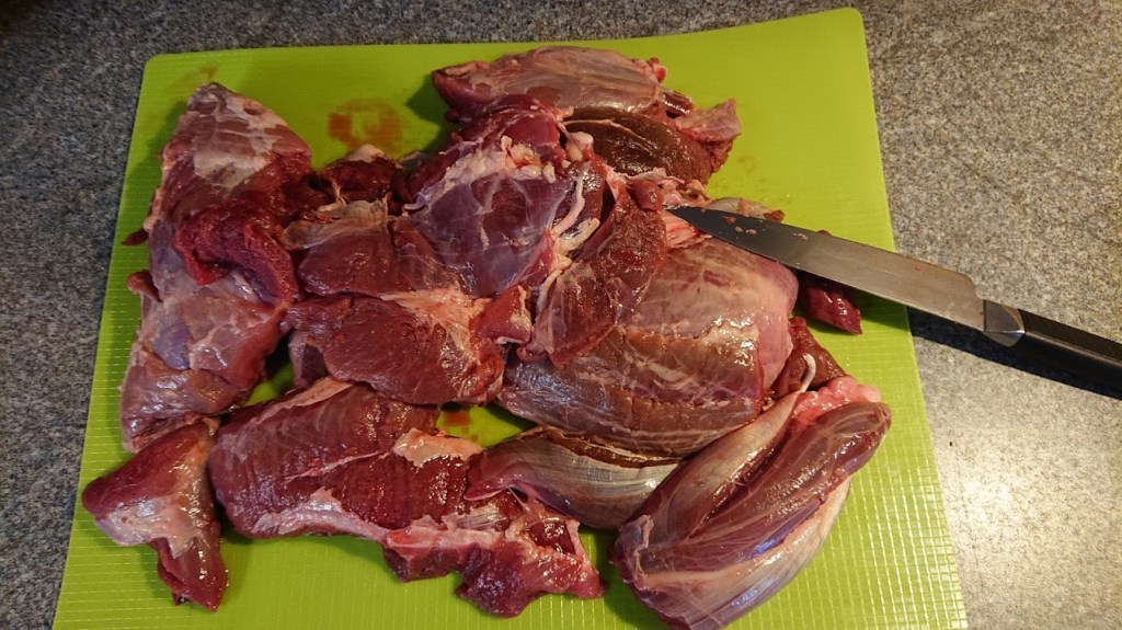 Die dafür benötigte Wildschweinschulter hatte ich wegen eines guten Schusses hinters Blatt vollständig zur Verfügung. Die Geschichte von dem Weizenschwein, was mich fast umgerannt hatte, kennen einige ja noch vom letzten Mal (siehe: https://krautjunker.com/2019/08/14/tom-heinzles-wildschweinkeule-mit-krautern-und-nussen/. An der Weizenkante kam plötzlich ein Überläuferkeiler im Vollspeed in meine Richtung. Ich schmiss meinen Zielstock um, nahm die Waffe in Anschlag und zehn Meter vor mir bemerkte mich die Sau. Sie drehte sich Richtung Weizen und bekam in dem Moment den erwähnten Schuss.
