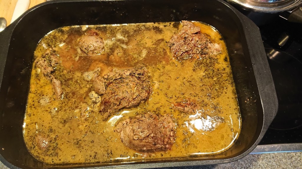Diese wurden mit weißem gemörserten Pfeffer, gemahlenen Pimentkörnern und Zwiebelpulver eingerieben. Schon beim Anbraten zog ein Duft durch die Gemächer, herrlich! Abgelöscht wurde mit einer leichten Gemüsebrühe und dann kam der Deckel auf den Schmortopf und der Herd wurde runtergeschalten.