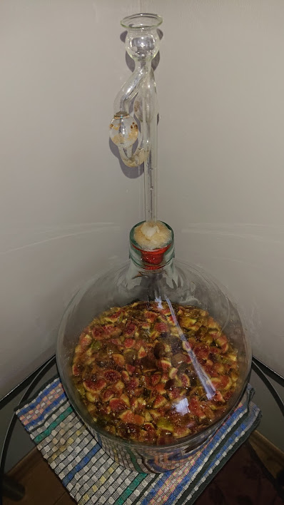 Ein prüfender Blick in den Schmortopf ergab, dass das Fleisch immer noch etwas Zeit brauchte. Im Rezept steht, es soll so lange köcheln, bis es fast zerfällt. Das konnte ich mir bei Fleisch aus der Schulter schwer vorstellen. Ist es doch sehr durchzogen von kräftigen Sehnen und Bändern. Also Deckel wieder drauf und in der Küche umgeschaut. Wir hatten in diesem Jahr eine gigantische Feigenernte. Von unseren Freunden aus der Slowakei vor sechs oder sieben Jahren mitgebracht, hat sich unser Feigenbaum schon im vorigen, aber vor allem in diesem Jahr prächtig entwickelt. Nachdem alle verfügbaren Gläser mit Feigenmarmelade gefüllt waren, wir und alle Nachbarn früh, mittags und abends statt Äpfeln Feigen gegessen hatten und ich dann doch nochmal zwei Kilo abgenommen hatte, entschloss ich mich dazu, den eingestaubten Weinballon vom Boden zu holen. Die Feigen waren schnell kleingeschnitten, ein Kilo Zucker, ein halbes Stück Hefe und sechs Liter Wasser dazu und ab in den am Vortag natürlich penibel entstaubten Ballon.