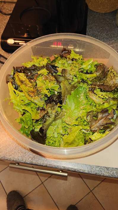 Den Salat habe ich „frei Schnauze“ gewürzt, paar mediterrane Kräuter und Rapsöl (schwedisches!). Kresse hatte ich leider keine parat, dafür wurde der letzte Dill im Garten geerntet.