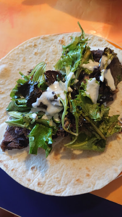 Nachdem alle ihre Gesichtsmuskeln wieder entspannt hatten, konnte sich jeder nach Herzenslust im Befüllen seiner Burritos austoben. Die Zusammensetzung ließ viele Varianten zu, sodass am Ende die Fladenbrote nicht reichten. Dass die eingelegten Zwiebeln fehlten, hat keiner bemerkt. Die Steinpilze waren mit dem Fleisch, der Meerrettichsoße und zwei Salatblättern zusammen mein Favorit.