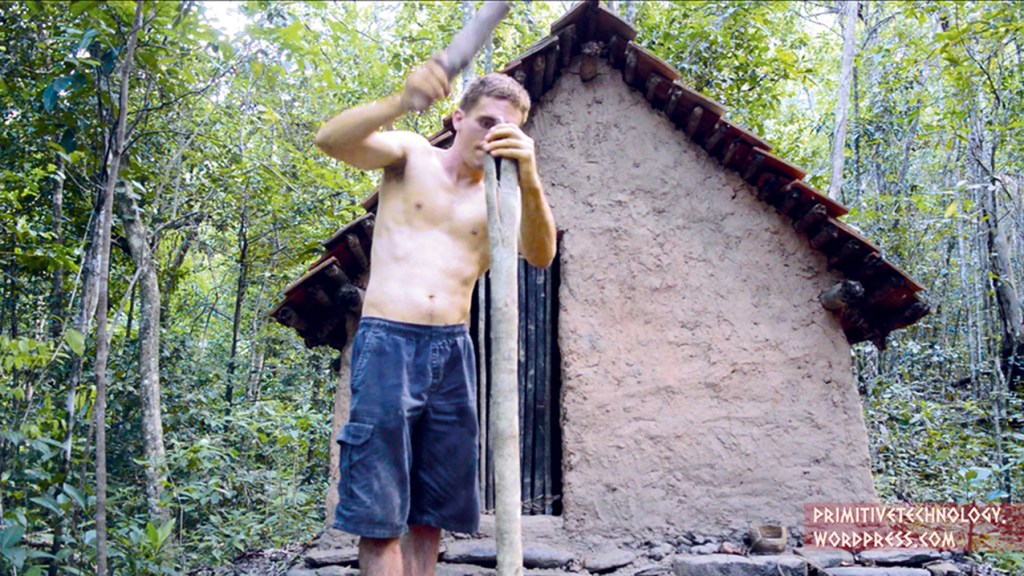 Hacken Sie mit dem Faustkeil etwas Holz ab, um den Bogenstab von der (dicken) Mitte hin zu den Enden zu verjüngen.