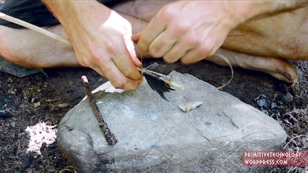 Schnitzen Sie mit der Steinklinge oder dem Meißel eine Sehnenkerbe ins hintere Ende des Pfeils, etwa 1 Zentimeter tief und 4 Millimeter breit.