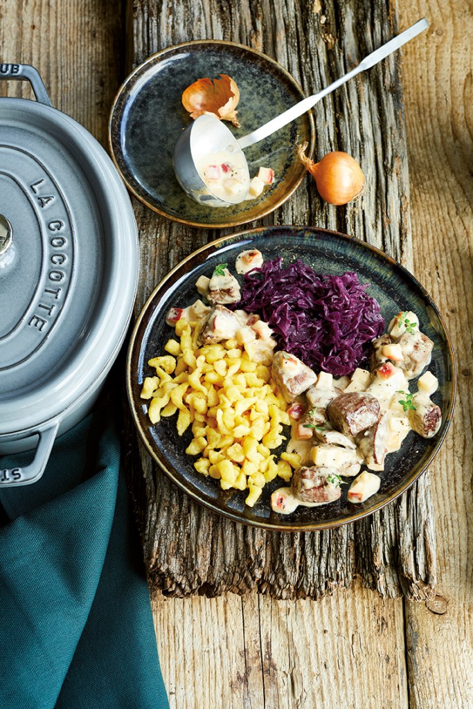 - Die Butter in der Pfanne zerlassen und darin die Zwiebel zusammen mit den Apfelwürfeln kurz andünsten. Mit Weißwein ablöschen, die Sahne angießen und alles kurz einkochen lassen. Nach Bedarf noch mit etwas Speisestärke abbinden.