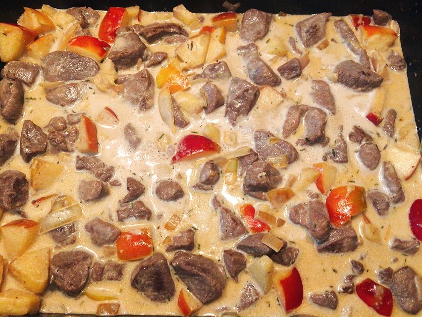 Äpfel und Zwiebeln anbraten, mit Weißwein ablöschen, Sahne dazu gießen. Entgegen dem Rezept fanden wir es ganz passend, das Apfel-Zwiebel-Gemisch noch mit Thymian zu würzen. Fleisch dazu geben.