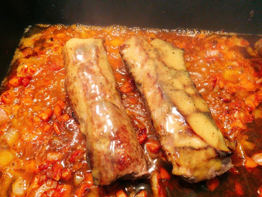 Zunächst werden alle Zutaten soweit nötig gewaschen, geputzt und in Form gebracht, d.h. Fleisch wird von Sehnen und Fett befreit, Gemüse gewürfelt. Das Fleisch wird scharf in Butterschmalz angebraten. In demselben Bratfett wird das Gemüse mit dem Tomatenmark angeröstet.