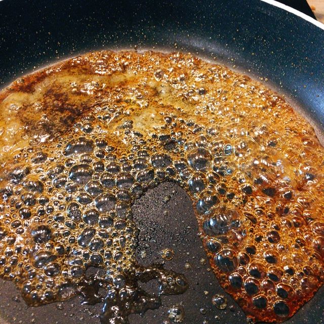 Während der Rücken mit dem Gemüse im Ofen schmort und gelegentlich mit der Marinade überstrichen werden muss, ist Zeit die Beilagen zu zubereiten. Zunächst wird Zucker in einer Pfanne geschmolzen und mit Weißweinessig abgelöscht.
