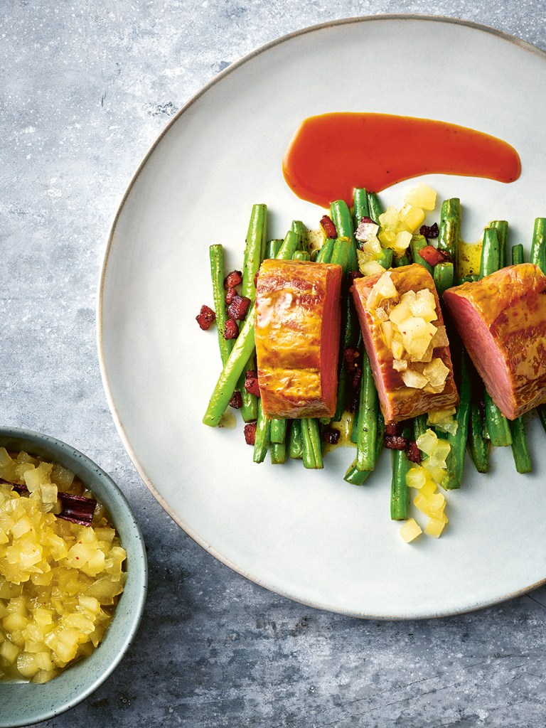 Honig und Senf – das war schon immer ein Erfolgsduo. Der saftige Rücken wird Ihre Gäste entzücken und ist mit dem Chutney und den Speckbohnen ein geschmackliches Highlight. Semmelknödel (s. Seite 67) passen auch noch dazu.