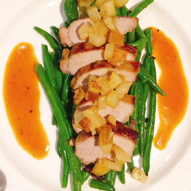 Wildschweinrücken mit Honig-Senf-Kruste, Birnenchutney und Speckbohnen