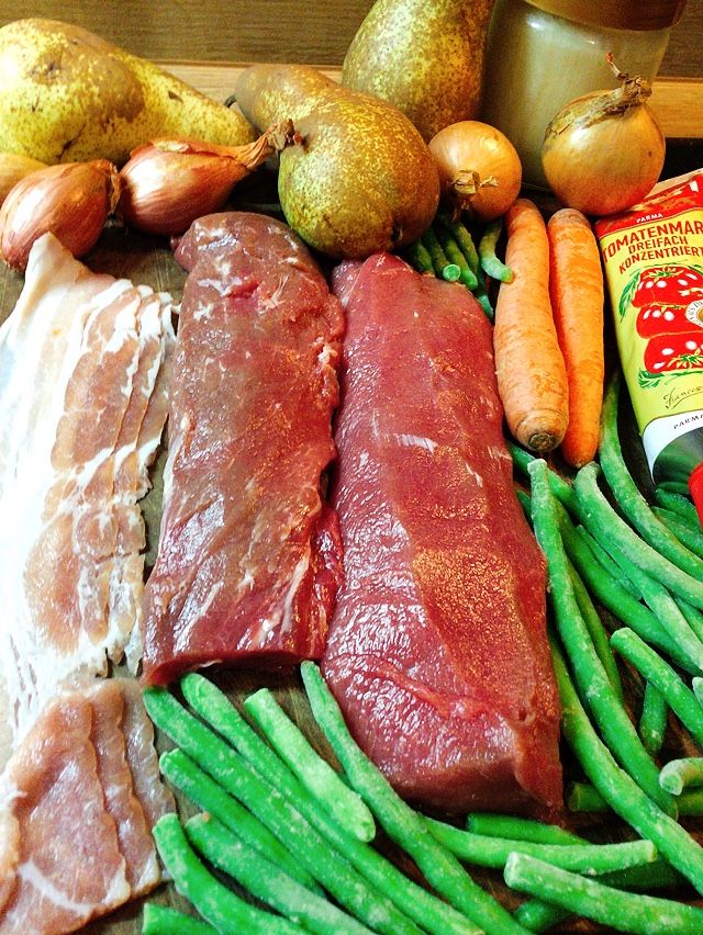 Auf der Suche nach einem Rezept für Wildschweinrücken bin ich dementsprechend logischerweise im Kapitel „Rücken“ fündig geworden. Birnen, Bohnen und Speck – ein Klassiker der norddeutschen Küche, umgesetzt als Wildgericht.