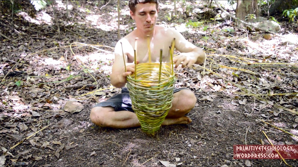 Flechten Sie biegsame Materialien zwischen die Holzstöckchen (C). Ziehen Sie die Holzstöckchen nach hinten, um am schmalen Ende des Kegels eine Öffnung zu formen. Bauen Sie die Reuse zusammen, indem Sie den Trichter in die Korböffnung stecken.