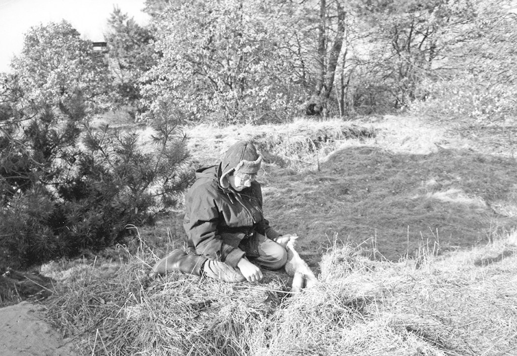 Nach dem ersten Treiben begann mein Sprössling zusammen mit meinem Freund Walter Zitzmann das geschossene Wild, das von den Treibern angebracht wurde, zu sortieren und aufzuhängen. Letzteres konnte er natürlich nur mit Walters Hilfe, aber er ließ nicht locker, jeden Hasen hielt er so lange fest, bis er an der langen Stange baumelte. Natürlich war er auf dem Wagen mehr hinderlich als nützlich, aber Walter ließ ihn das selbstverständlich nicht merken. Max hatte eine wichtige Aufgabe übertragen bekommen und er mühte sich nach Kräften – und noch weit darüber hinaus – diese zu erfüllen. Nach dem zweiten Treiben konnte ich Max, den ich zu diesem Zwecke schnell vom Wagen holte, an einen Hasen in der Sasse heranbringen. Als Führer meiner großen Treiberwehr konnte ich schon entsprechend disponieren. Als Max den Hasen endlich sah, waren wir noch etwa fünf Meter von der Sasse entfernt. Ruckartig verhoffte Max und stand dann dem Hasen bombenfest vor, wie ein Vorstehhund. Er stand völlig im Banne des Wildes und war keinen Schritt mehr weiter zu bringen. Erst als der Mümmelmann nach einem Erdkrumenwurf aus seinem Lager spritzte, löste sich bei Max die Verkrampfung in einen lauten Jubelschrei auf.