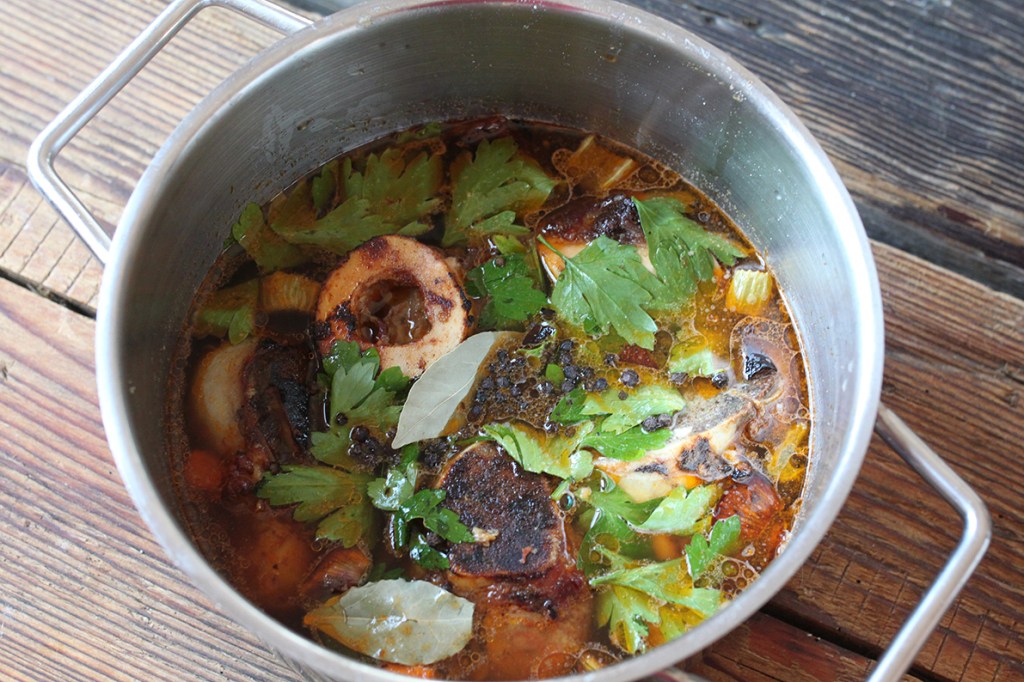 Das Backblech sauber machen und die Knochen drauf. Noch mal ca. 45 Minuten die Knochen bei hoher Temperatur – z.B. 220 Grad fertig rösten, wenn der Knochen etwas schwarz wird ist das kein Problem.