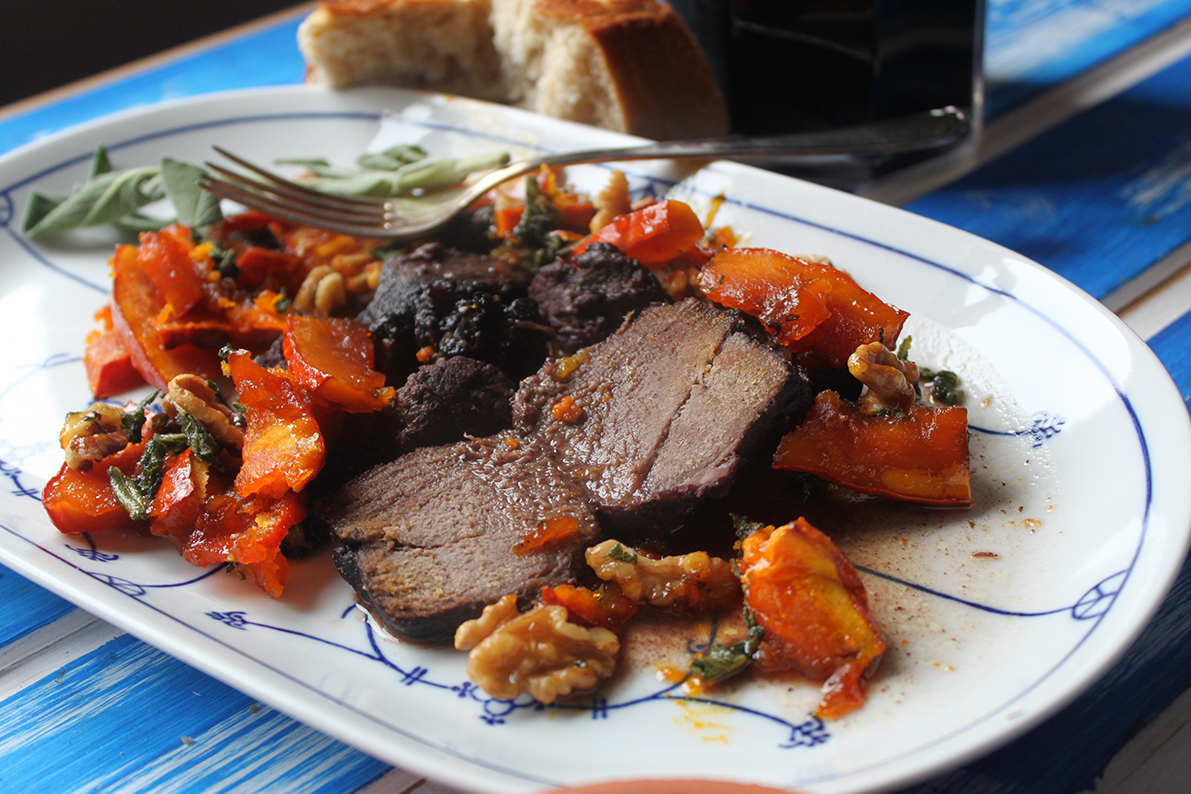 Brunos Gartenkochbuch: Geschmortes Wild mit gerösteten Kürbisscheiben an Salbei und Walnüssen