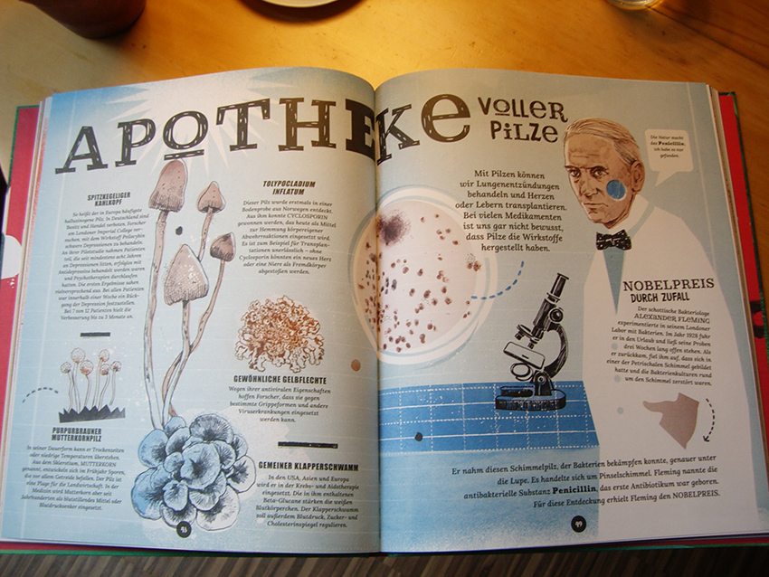 Die paar Unstimmigkeiten, wie die zufällige Invasion durch Butterpilze im Rindenmulch, die tödliche Kombuchapilzattacke und die durchaus auffallende nicht erwähnte Wirkung des Mutterkorns als was ANDERES als Blutdrucksenker, lassen sich gut mit den interessanten und wahnsinnig gut illustrierten Artikeln zu Plastik aus Pilzen, Hexenringen, Schimmelkäse und der Pilzen als Jäger ausgleichen.