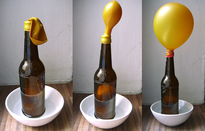 Mit einem Luftballon, Hefe, Puderzucker, warmen Wasser und einer alten Bierflasche ließ ich ein Wunder entstehen: Der Luftballon wurde vor unseren Augen von der brodelnden Hefe aufgeblasen.