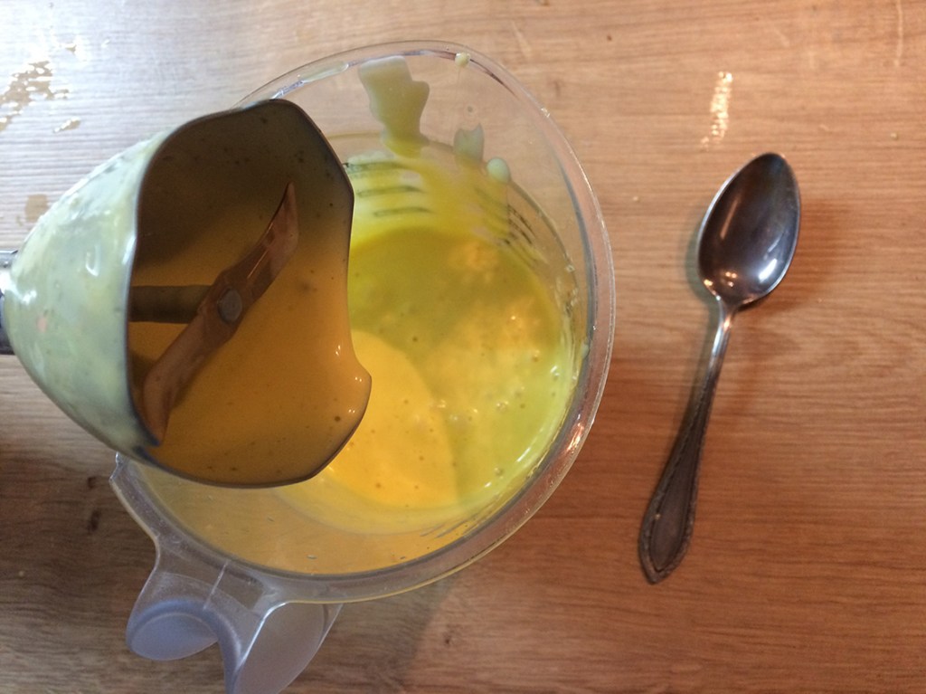 Für den Dip Öl, Zitronensaft, Ei, Senf und hellen Balsamico in einem Rührbecher aufmixen und mit Salz, Pfeffer sowie ggf. Zucker abschmecken. Ehrlich gesagt fand ich den Dip ein bisschen langweilig. Am besten selbst probieren, mein Tipp wäre ansonsten etwas Estragon.