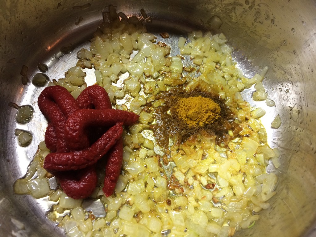 Currywurst: Inzwischen für die Sauce die Zwiebel schälen und sehr fein hacken. 2 EL Öl in einem Topf erhitzen und die Zwiebel darin glasig dünsten. Das Tomatenmark dazugeben und kurz mitbraten, mit 1 Schuss Wasser ablöschen. Dann die Hitze reduzieren und Ketchup, Essig und Honig dazugeben. Alles gut verrühren. Das Currypulver dazugeben, das Chilipulver nach und nach hinzufügen, damit die Sauce nicht zu scharf wird. Wenn die Sauce dickflüssig ist, etwas Wasser dazu geben. Bei schwacher Hitze warm halten.