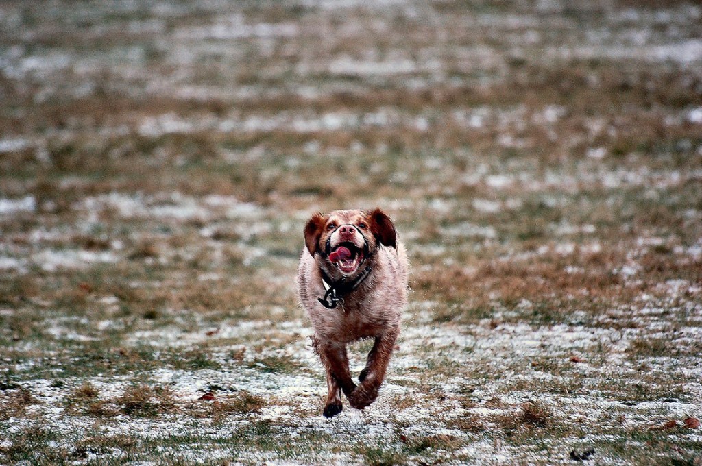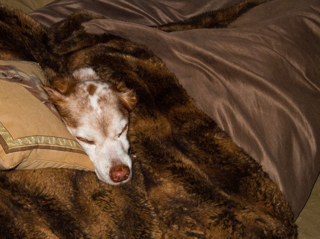 Verzeih mir bitte jedes Mal, wenn ich Dich weggeschoben habe, Dich nicht gestreichelt oder gekrault habe, wenn Du es wolltest und mir das zeigtest, verzeih mir jedes abgebrochene oder gar nicht erst begonnene Spiel mit Dir, jedes Wegschicken, jedes ungerechte laute Wort, jede ungerechte Tat. Die bereue ich jetzt – und viel mehr noch die ungenutzten Momente und Gelegenheiten. Ich danke Dir so vieles: so viele Tage, die Du nur durch Dein Dabeisein reicher und schöner gemacht hast. So viele gemeinsame Gänge, die durch Dein hirnlos-seliges Herumtollen und Herumrasen zum Erlebnis wurden – besonders dann, wenn Du auf Ruf oder Pfiff irgendwann dann doch mal reagiertest in Deinem Hundeglück, und dann, wenn ich in die Knie ging und die Arme ausbreitete, die Ohren richtig anlegtest, richtig Gas gabst und freudestrahlend auf mich zugerast kamst, mich umwarfst und wir beide uns balgend im Dreck wälzten. In den späteren Jahren, als Du ruhiger wurdest, da waren es Deine tapsigen Tänze, wenn ich nach Hause kam, die mir jedes Mal das Herz füllten – und auf Deine alten Tage, als Deine Augen trüb und blind geworden waren und Deine dicke, rote Nase Dein einziges Radar wurde, da war es diese ganz eigene, unverwechselbare Bewegung, mit der Du Dein Haupt in meine Hand legtest und Dich unterm Kinn kraulen ließest, um dann irgendwann auf Dein Kissen zu stiefeln, Dich einzurollen und einzuschlafen. Die Tür zur Terrasse, die musste offen bleiben, auch in den kalten Nächten, damit Du rauskonntest. Ich deckte Dich, wenn Du wieder reingekommen warst, mit Deiner Decke zu. Du öffnetest dann Deine blinden Augen, schmatztest ein, zwei Mal und schliefst wieder ein.
