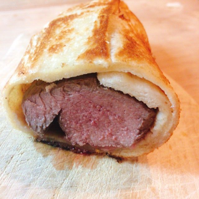 Die „Riesenscheibe“ wird mit Brät bestrichen (Wer kein Brät bekommen hat, kann ein bisschen Wild durch die feine Scheibe des Fleischwolfs drehen, ggf. mit einem Schluck Sahne auf eine cremige Konsistenz bringen und etwas pikant abschmecken), den Rücken darin stamm eingewickeln und in heißem Butterschmalz rund herum anbraten, dann geht´s zum Nachgaren in den auf 90 Grad vorgeheizten Backofen.