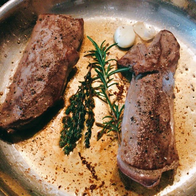 Also ab mit dem Rücken in die heiße Pfanne, begleitet von Rosmarin und Thymian. Ich habe mir erlaubt, noch eine angedrückte Knoblauchzehe beizufügen.