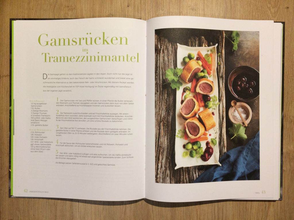 Wieder zu Hause, möchte man natürlich einiges nachkochen, für die Alpenküche gibt es diverse Kochbücher, auf Jäger und Wildliebhaber ausgerichtet ist Unwiderstehlich Wild – Die besten Rezepte aus Südtirol, Tirol, Bayern und dem Aargau, herausgegeben von den regionalen Jagdverbänden. Bereits beim ersten Durchblättern hat mich ein Rezept angesprochen, eigentlich eher das zugehörige Foto: Gamsrücken im Tramezzinimantel.