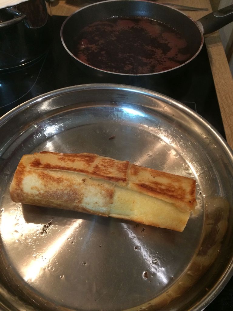 Parallel zum Anbraten werden die Tramezzinischeiben überlappend ausgelegt und flachgerollt. Mir ist es nicht gleich auf Anhieb gut gelungen (die Scheiben haben sich nicht gut verbunden und beim einwickeln wieder gelöst), also vorsichtshalber ein paar Scheiben in Reserve halten.