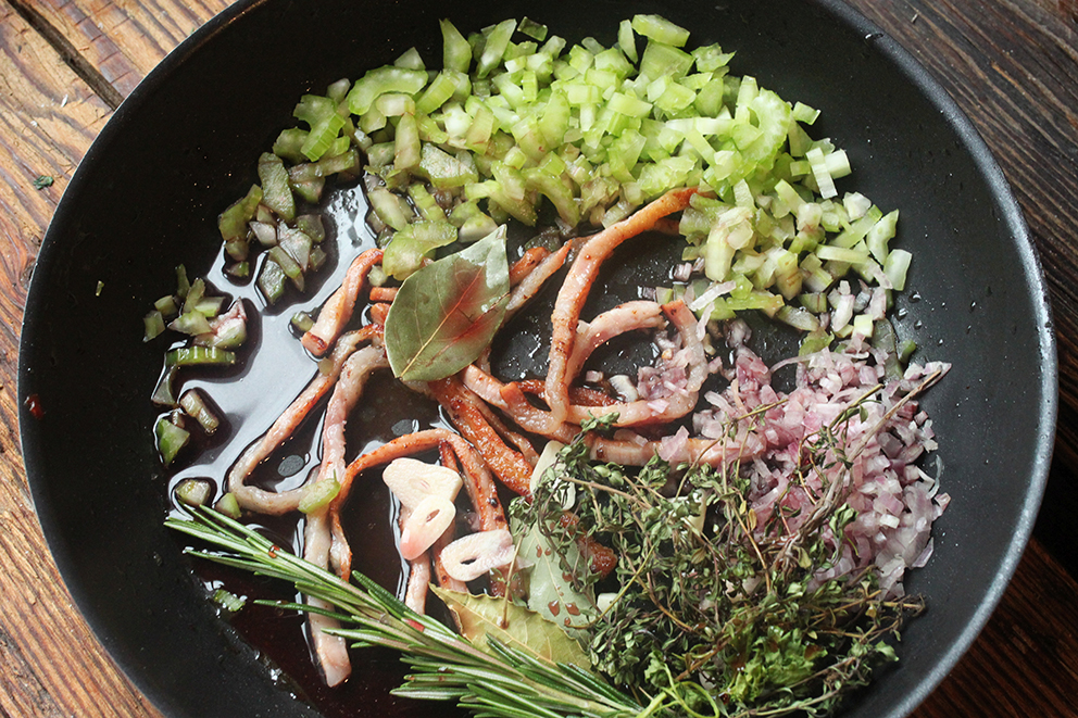 In den Schmortopf gab ich nen Löffel Olivenöl und briet die Speckstreifen bei mittlerer Hitze bis sie schön braun und leicht knusprig waren. Eine Stange vom feingewürfelten Staudensellerie, zwei gehackte Schalotten, eine gescheibelte Knoblauchzehe, 2 kleine Lorbeerblätter und je einen Thymian- und Rosmarinzweig gab ich zu dem gebratenen Speck in die Pfanne, rührte und dünstete das Gemüse für circa 10 Minuten, bis es weich war.