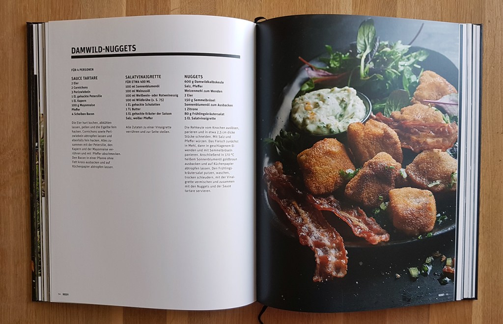 Es kam das beiliegende Rezept „Damwild-Nuggets“. Auf der Zutatenliste stand „Damwildkalbskeule“ ganz oben. Die Rezeptbeschreibung begann mit „Die Rehkeule vom Knochen auslösen …“. Ha, dachte ich mir genau mein Humor, eine Damwildkalbskeule hätte ich nämlich auch nicht zu Griff gehabt.