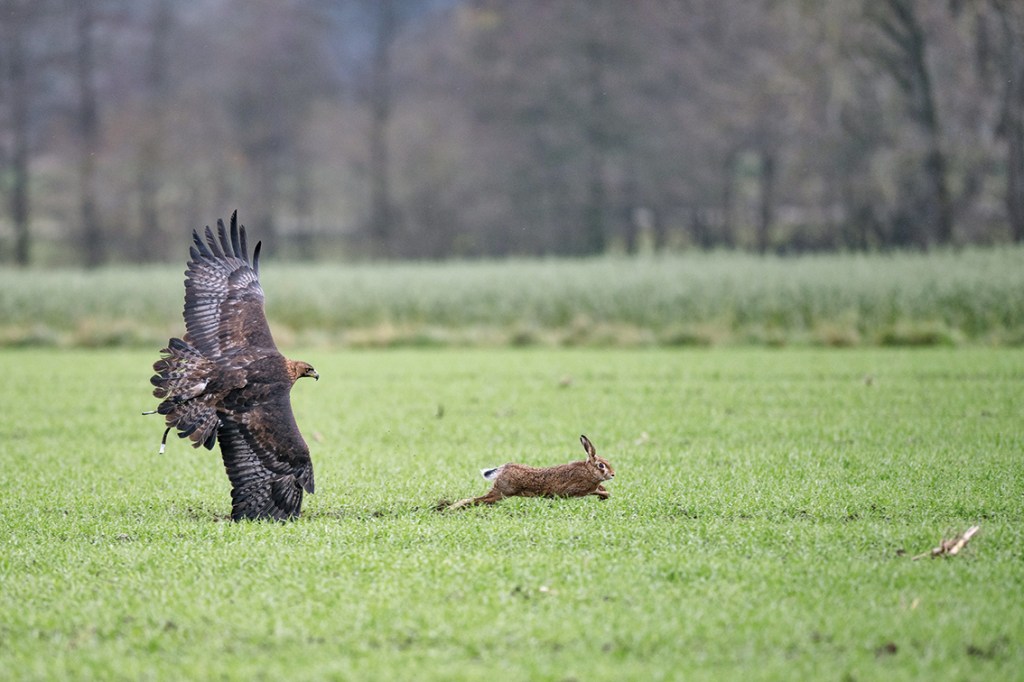 An einem kalten Dezembermorgen findet ein Jagdtag mit drei Steinadlern, zwei Habichten und zwei Harris Hawk auf rasante Feldhasen statt.