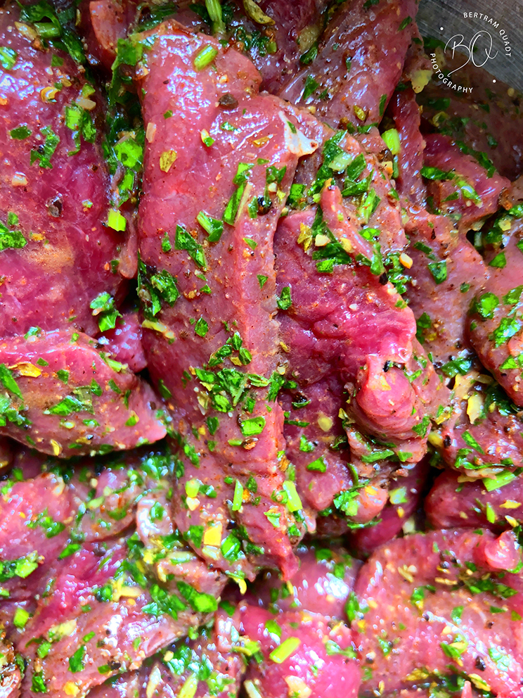 Das Fleisch: den perfekt geputzten Rehrücken auf halbzentimeterstarke Scheiben schneiden. Marinieren mit drei Pfeffern (weiß, schwarz, Piment), Muskat, Zimt, glatter Petersilie, Minze, Zitronenabrieb, etwas Weißweinessig, gutem Olivenöl und dem Geheimmittel meiner Frau. Und das bleibt auch ein Geheimmittel.