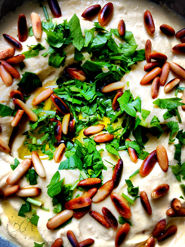 Hummus macht man am besten „from scratch“, also nicht mit Dosenware, sondern brav über Nacht gewässerten und dann erst mal mit Hausnatron angewärmten und anschließend gekochten und pürierten Kichererbsen. Öl, Zitronensaft (gern viel), erstklassiges Tahini. Kreuzkümmel ist ein Kann, kein Muss.