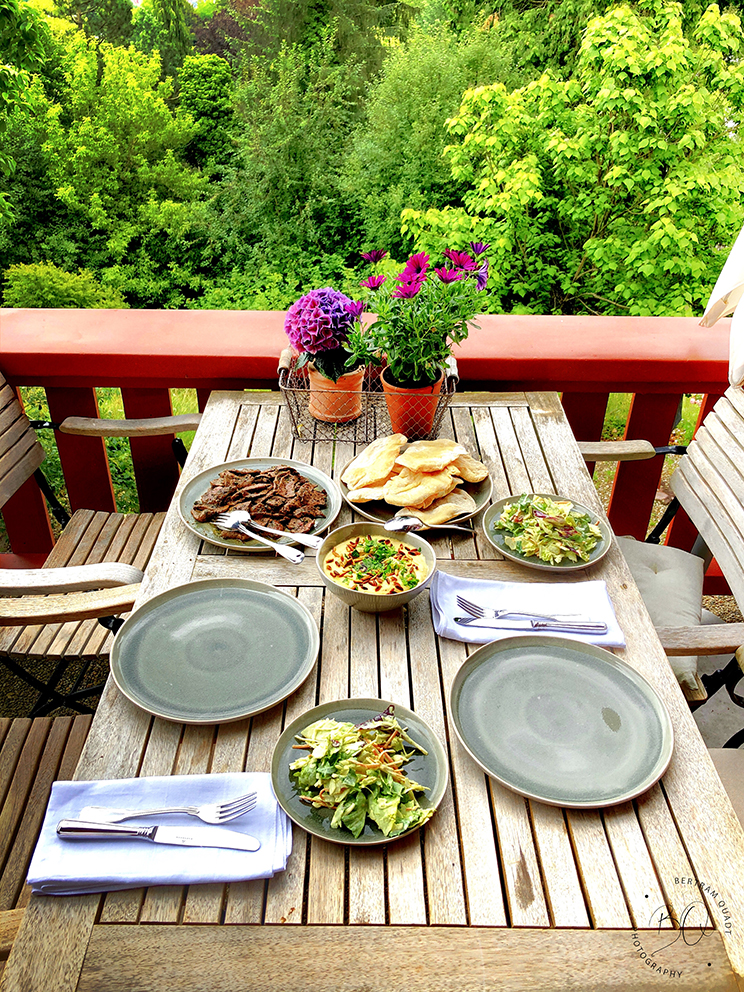 Das fertige Fleisch stückweise auf oder in die Pita, ein Klecks Humus drüber, ein feiner Salat dazu – der Muggensturmer Bock hat ein würdiges Ende gefunden.