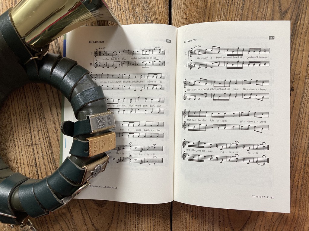 Die Zeilen des Gedichts finden sich in Signalen wie „Das hohe Wecken“, „Aufbruch zur Jagd“, „Hunderuf“ oder „Sammeln der Jäger“ und natürlich in den so genannten Totsignale wieder. Diese Signale sind heute immer noch Bestandteile von Jagden und Wettbewerben. Die entsprechenden Notenvorlagen sind im Buch abgedruckt; von Aufmachung und Umfang weitgehend identisch mit dem ebenfalls im Kosmos Verlag erschienen Büchlein Die Jagdsignale. Bei den Noten zeigt sich, dass der Kosmos Verlag modernen Medien gegenüber aufgeschlossen ist: Der Leser kann sich eine kostenlose App herunter laden und in dieser sein Buch auswählen; gibt er dann die im Buch jeweils am Rand des Notenblatts genannten Nummer ein, wird das entsprechende Musikstück abgespielt.