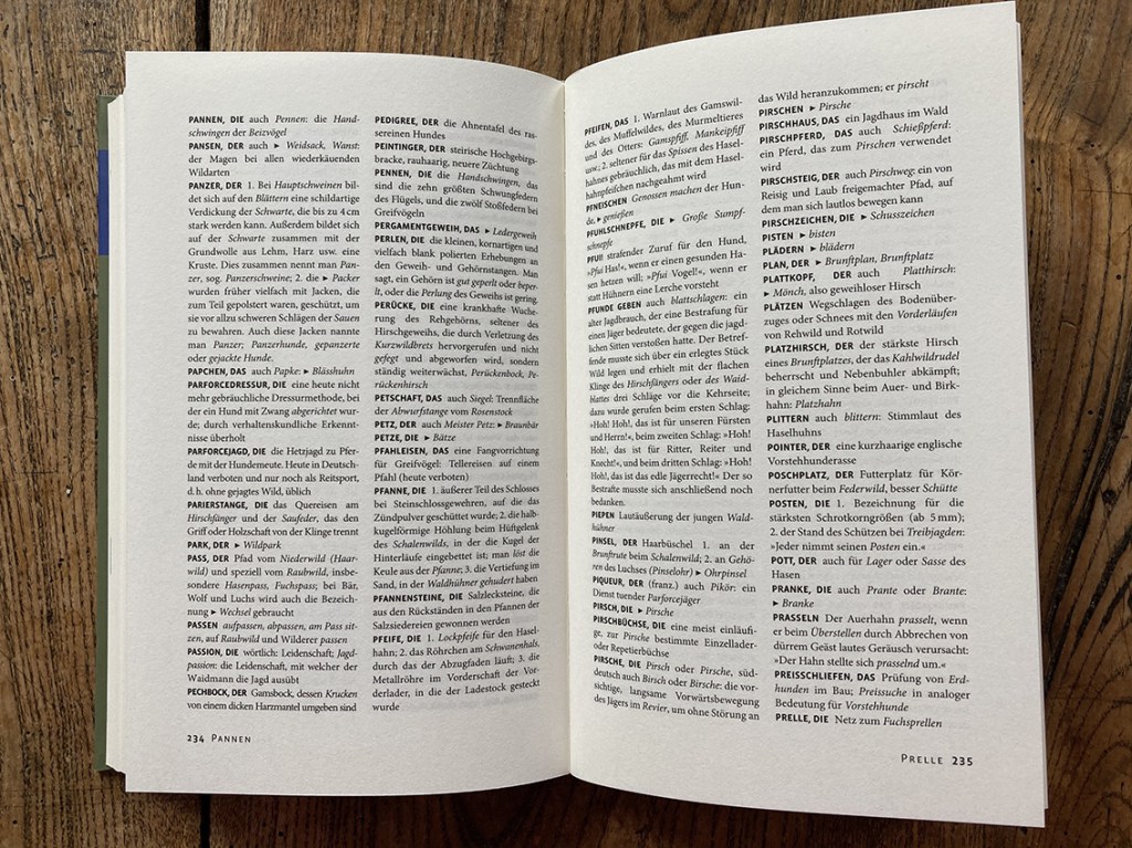 Es reicht von A wie Aalstrich („dunkler, vom Nacken bis zum Wedel reichender Streifen in der Decke bei Hirscharten, Gamswild (Sommer), Steinwild und Hunden (Schweißhund, Teckel)“) bis Z wie Zwitterhahn („Rackelhahn“).