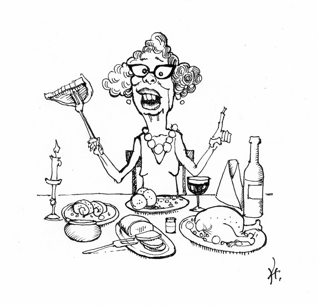 Der Hauptgang wurde mit dem Satz „Eigentlich essen wir gar kein Fleisch!“ eingeleitet, gefolgt von der Feststellung: „Das kann man ja gar nicht mehr verantworten.“ Beifälliges Gemurmel von den Damen am Tisch, stummes, schicksalsergebenes Nicken der Herren. Aufgetragen wurde Hirsch(!), von dem – nur so viel vorweg – nichts übrig blieb. Gisela begleitete das Mahl mit einem appetitlichen Vortrag zur Massentierhaltung. Sie selbst kam kaum zum Essen, da sie die Gelegenheit weiterhin dazu nutzte, pausenlos auf ihre wehrlosen Opfer einzureden. Diese – wohlerzogen – sprachen nicht mit vollem Mund und hatten auch nicht die Gelegenheit, die Tafel zu verlassen, ohne grob unhöflich zu werden. Mir erklärte sich nun, warum die Dame so entsetzlich dürr war. Meine Gedanken schweiften ab, ich dachte an den letzten Hirsch, den ich strecken konnte.