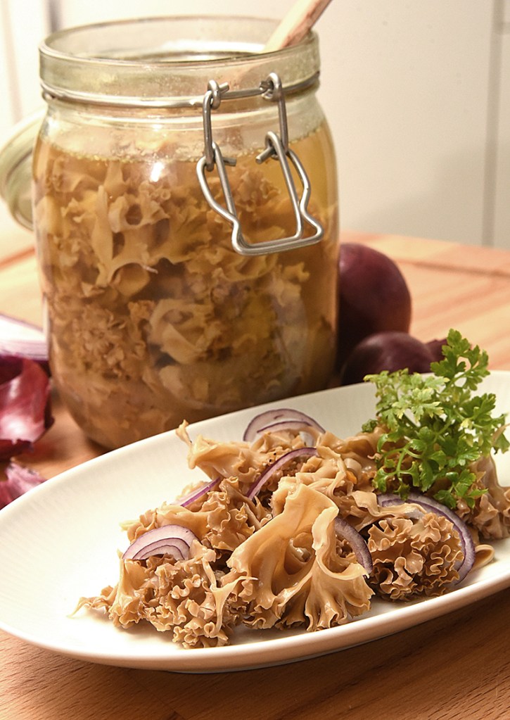 Es ist eine ganz einfache Art, die Krause Glucke haltbar zu machen. Sie kann dann auf vielfältige Weise zubereitet werden, z. B. als Salat-Beilage zu einem Wild-Gericht, in einem Asiatischen Gemüse, leicht angebraten mit Ei oder als Pilzfüllung einer Gemüse-Frucht. Wie auch immer, der Fantasie sind keine Grenzen gesetzt. Die Krause Glucke behält ihre Bissfestigkeit und einen feinen Geschmack.