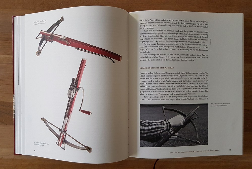 »Die Begeisterung Maximilians für die Armbrustjagd ist durch vielerlei Begebenheiten bezeugt: 1490 etwa schenkte Maximilian dem ebenso leidenschaftlichen Jäger Erzherzoog Sigmund (1427-1496) bei dessen Übergabe Tirols an den Kaiser eine große Armbrust. Vor entscheidenden Ereignissen erholte sich Maximilian gern beim Jagen und entzog sich damit oft unangenehmen Situationen. Zweifellos bot die jagdliche Umgebung nicht zuletzt eine entspannte Atmosphäre, um prekäre diplomatische Themen zu verhandeln. Auch wenn die Zeitgenossen vermutlich übertrieben, so darf durchaus angenommen werden, dass Maximilian ein sehr guter Schütze war. Quellen zufolge war er zudem ein geschickter Handwerker, der seine Pfeilspitzen selbst schmieden konnte.«